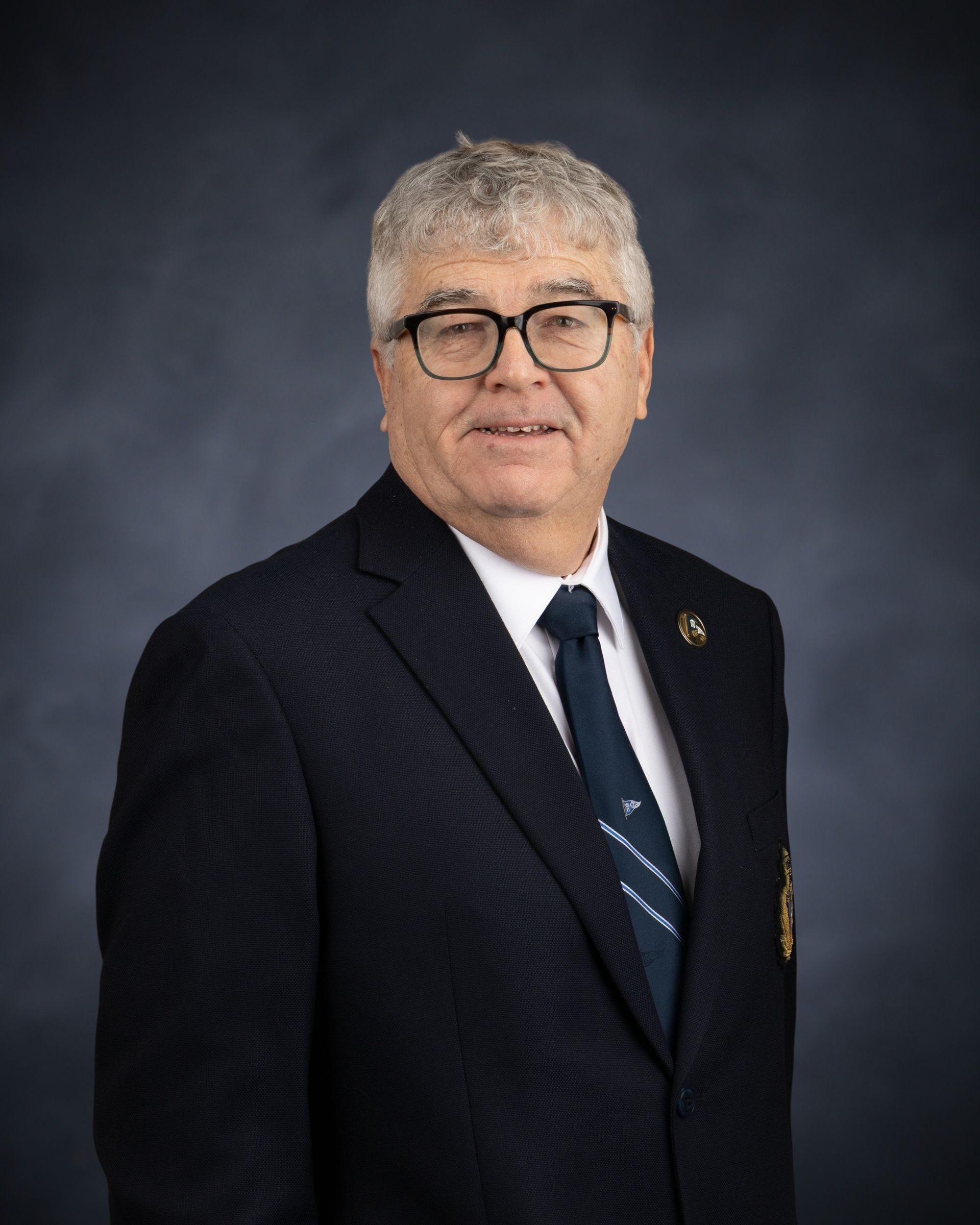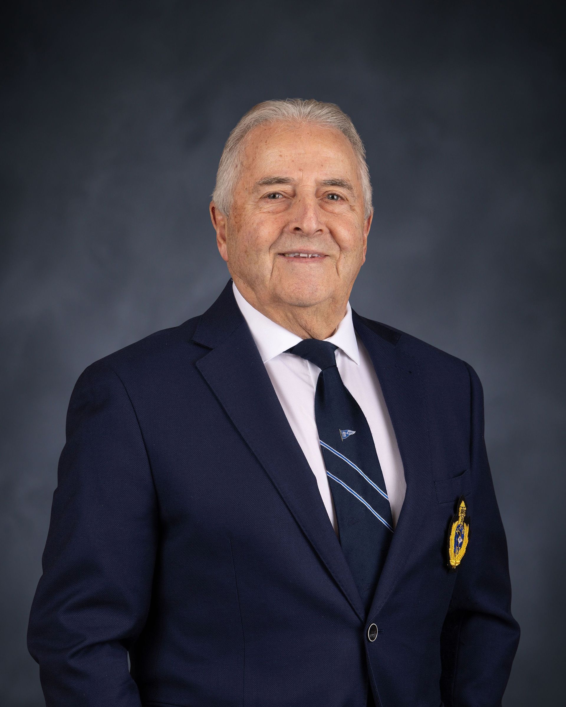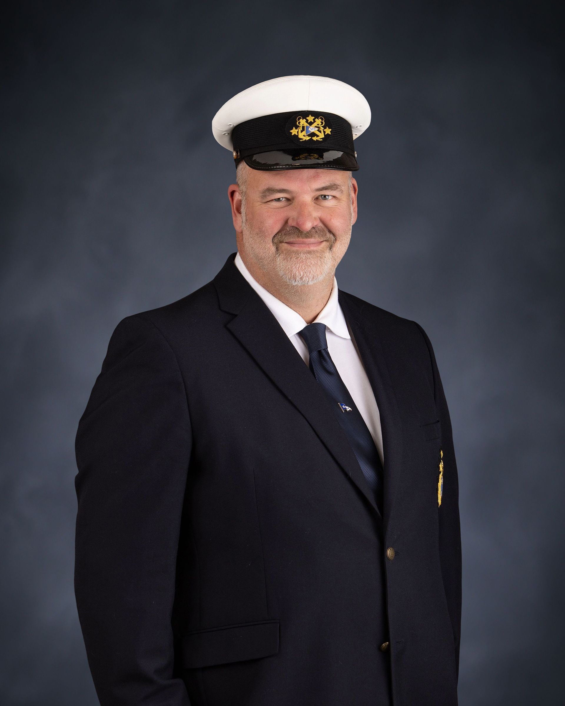 The Commodore's flag is white bearing a navy blue cross and the Commodore has 3 gold stars surrounding the club crest on their cap.